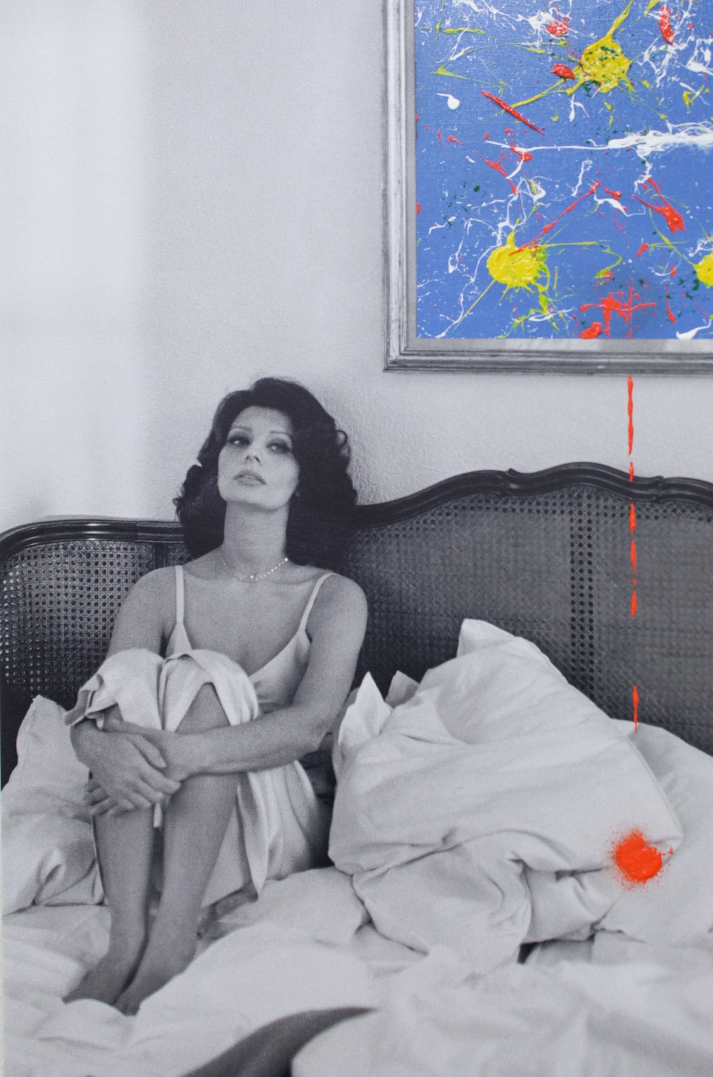 Italian actress Sophia Loren cuts a wistful figure during the filming of the 1978 film Brass Target in Switzerland. The frame on the wall, which in the original photograph held a painting of a mediaeval court scene, is replaced in Taupin's interpretation by a colourful abstract-expressionist piece, its paint leaking into the containing photograph to form a unsightly orange blotch on the actress's pristine white sheets.