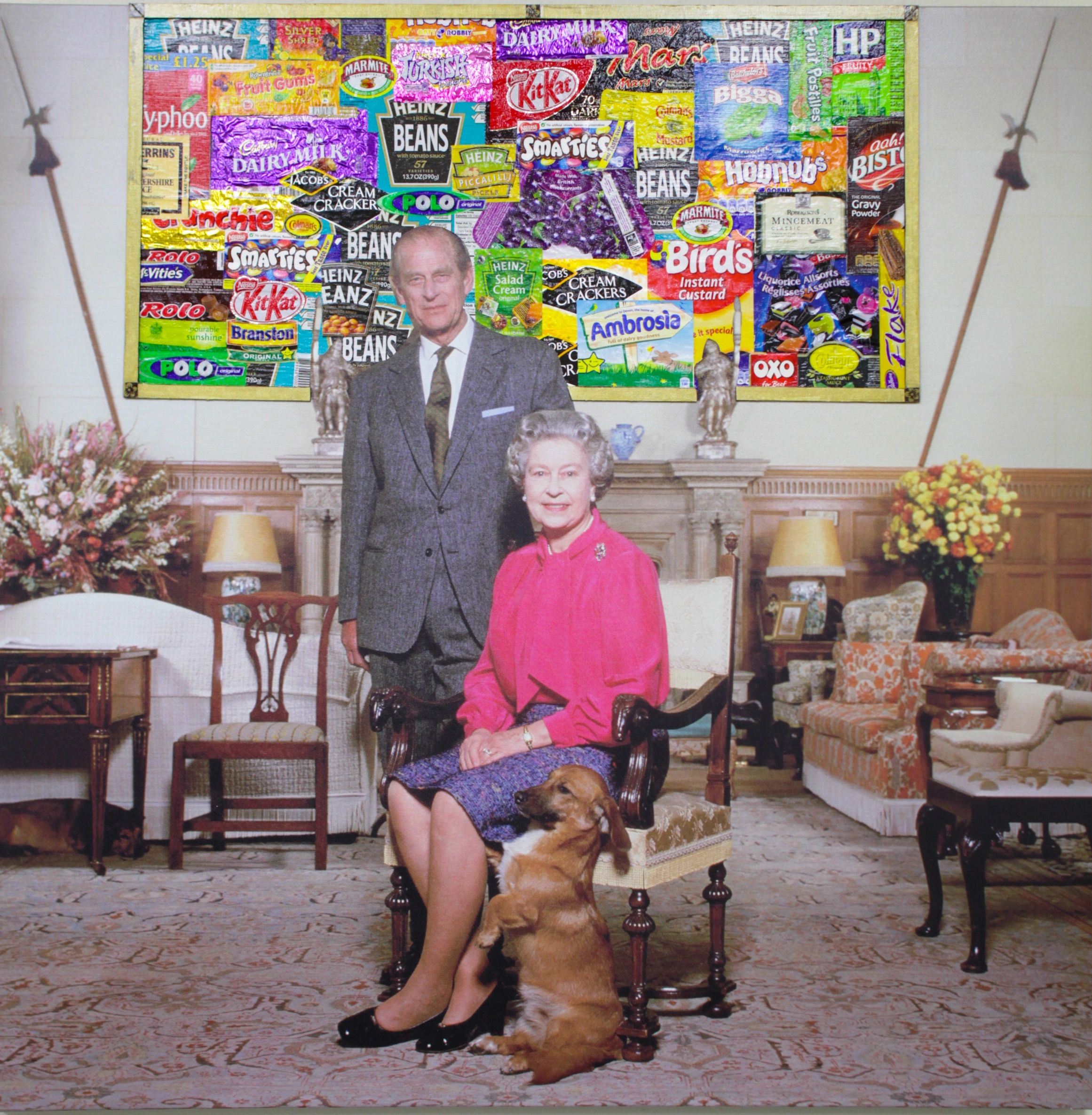 Queen Elizabeth II and Prince Philip pose for their official portrait in 1992. The piece on the wall in the background, which originally depicted a mediaeval scene, has been replaced by a vibrantly-coloured collage of logos from quintessentially British brands, a comment on the broad scope of national identity.