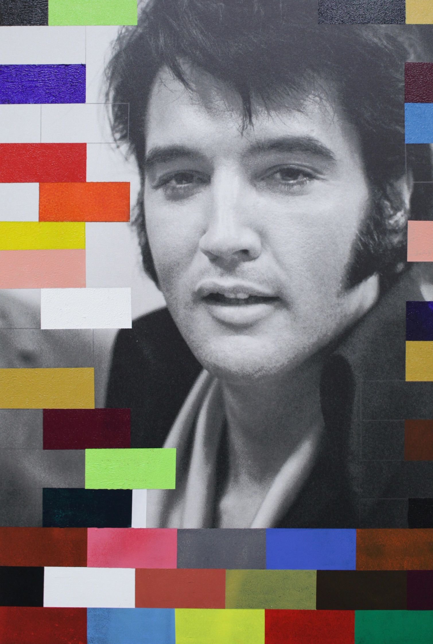 In his famous high collar and a scarf, legendary singer Elvis Presley arrives at the International Hotel in Las Vegas, Nevada on August 1st, 1969, the day of his comeback press conference. With his addition of a wall of multi-colored, pixel-like blocks, Taupin's reworking and its title allude to the coercive influence Elvis's manager Colonel Tom Parker held over the singer's life and career.