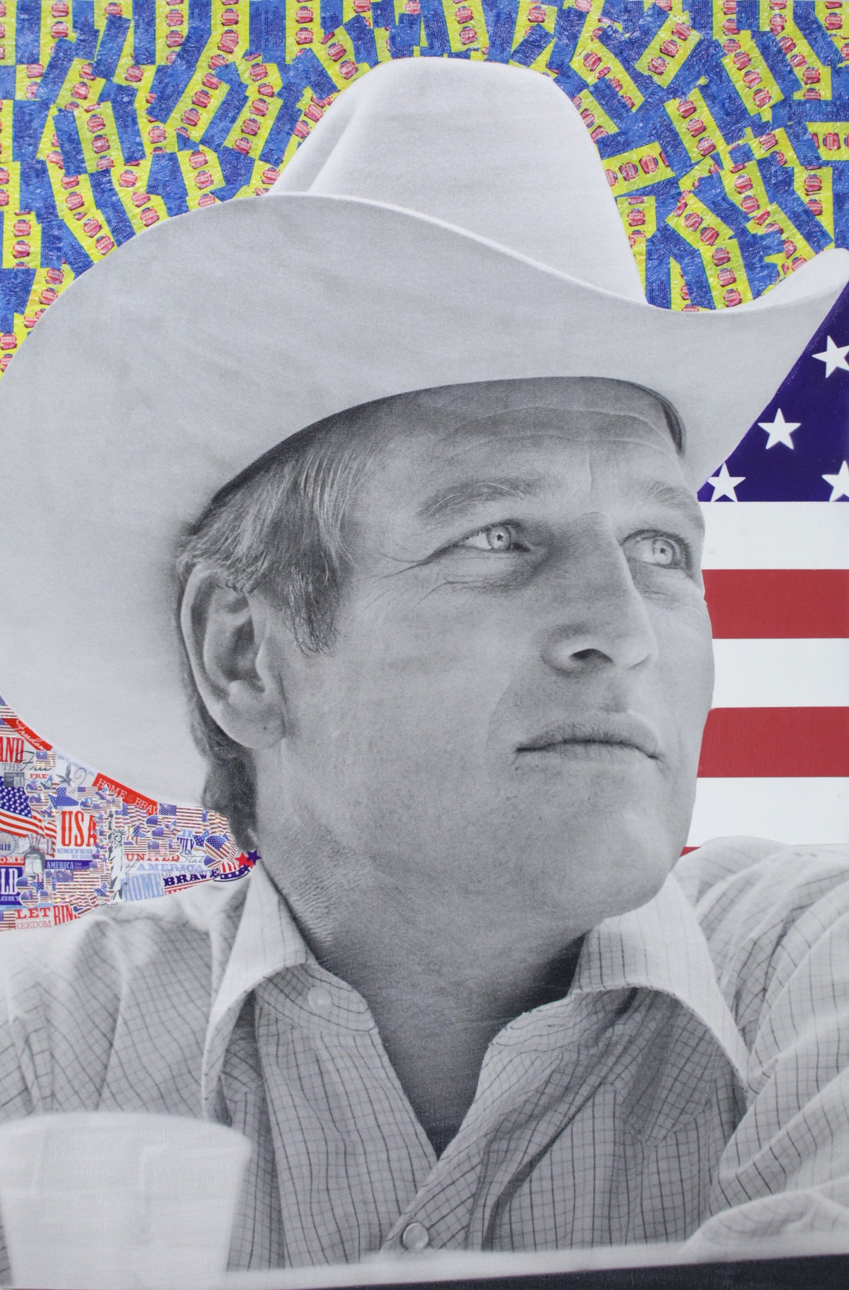Paul Newman poses in a cowboy hat in Tucson, Arizona, in a publicity still for the 1972 comedy western Pocket Money. Newman, behind whom Taupin has arranged a downpour of gum wrappers and a section of the stars and stripes, was a conflicted patriot: a lover of cars and cold Budweiser who found himself on Richard Nixon's enemies list for opposing the Vietnam War.